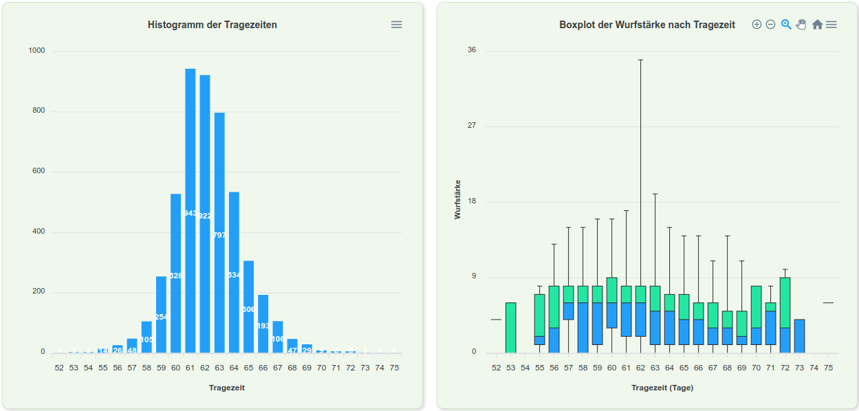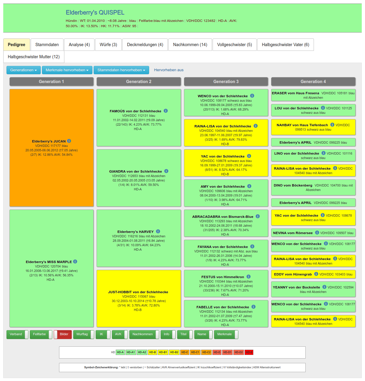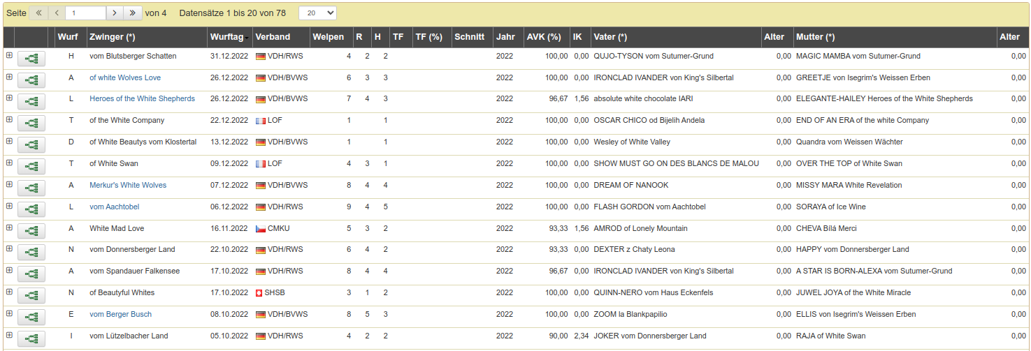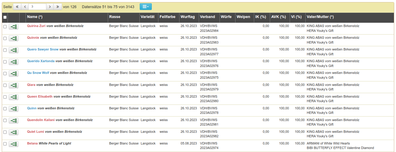 Unseren Züchtern und Mitgliedern steht eine umfangreiche Zuchtdatenbank für die Recherche und Zuchtplanung zur Verfügung. Zahlreiche Statistiken ergänzen das Angebot und bieten auch dem Laien eine gute Möglichkeit sich über die historische Entwicklung der einzelnen Zuchtlinien zu informieren.